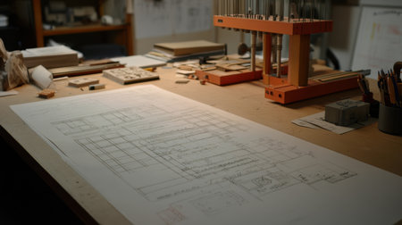 Close-up view of a woodworking project with a blueprint, tools, and materials on a workbench, showcasing the intricate planning and craftsmanship involved in carpentry.