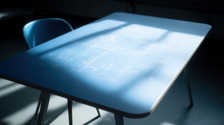 Blueprint clamped under glass with soft natural light highlighting the paper texture