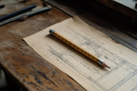 Carpenter pencil and ruler lying on a blueprint on a wooden desk, suggesting design and construction work