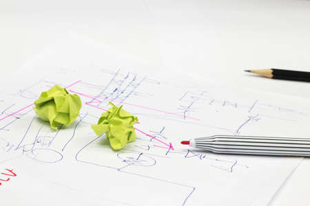 electronic single line and fire alarm riser schematic diagram on crunpled paper