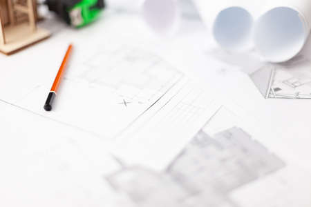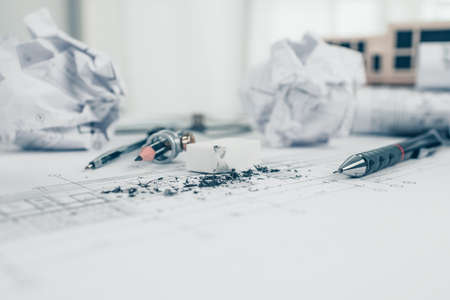 eraser crumbs, compass and pencil on drawing design working on bueprint. House planning design and construction concept.