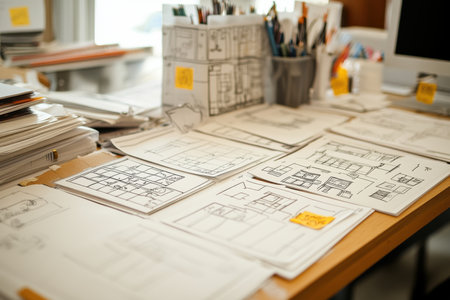Architectural blueprints and sketches on desk office studio detailed planning creative environment overhead perspective
