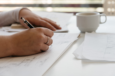 Girl architect draws a plan, graph, design, geometric shapes by pencil on large sheet of paper at office desk.