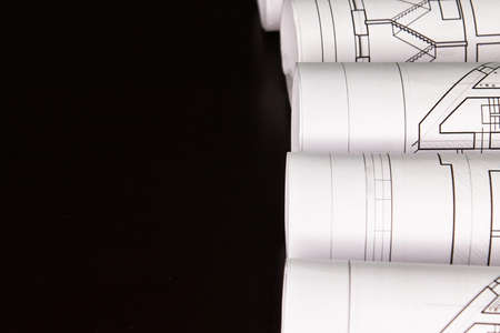 Rolled blueprints or architectural drawing paper view from a high angle. House plan blueprints rolled up. Building construction industry concept