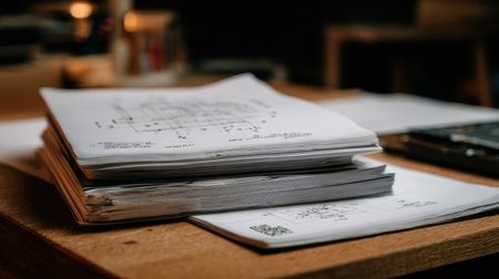 A stack of technical drawings and paperwork lies on a wooden desk in a cozy office, creating an inspiring workspace perfect for creative projects.