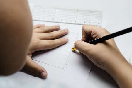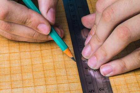 draftsman draws on a ruler on the graph paper