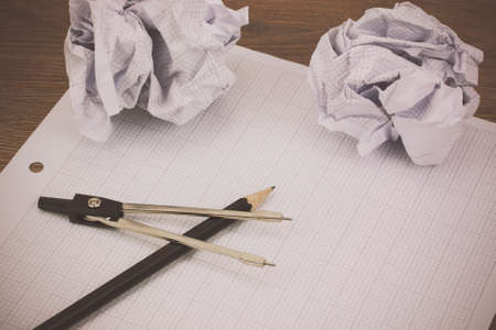 Calculator and drawing equipment and graph paper on a table. Retro filter applied.