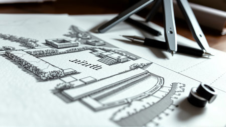 A visually rich scene of architectural drafting tools and detailed sketches displayed on a wooden table in a creative workspace, evoking a sense of artistry and precision.