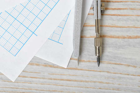 Layout with pencil and compass on white paper which is on wooden surface. Top view composition. Engineering stuff. Work place of draftsman, architect, constructor. Construction and architecture. Measurement.