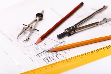 blueprint with compass, square and pencil