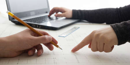 Close up view of engineer man hand drawing on blueprint and briefing with his colleague on office desk