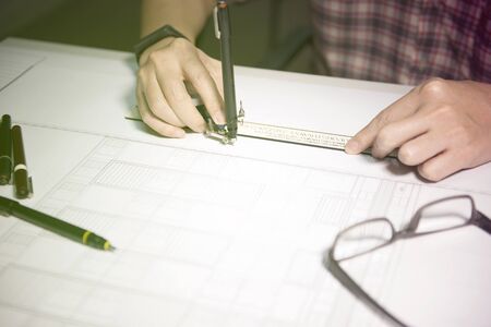 Architect working on blueprint, Engineer working with engineering tools for architectural project on workplace, Construction concept - building project, blueprints, ruler and dividers.