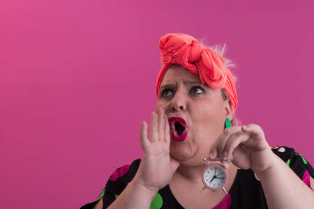 Portrait of plus size young lady smiling hands holds sand clock isolated on pink color background.