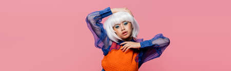 Trendy asian pop art woman posing and looking at camera isolated on pink, banner