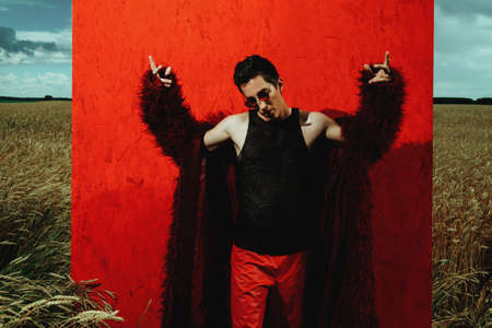 Fashion shot of a professional handsome male model in long red fur coat posing in a wheat field.