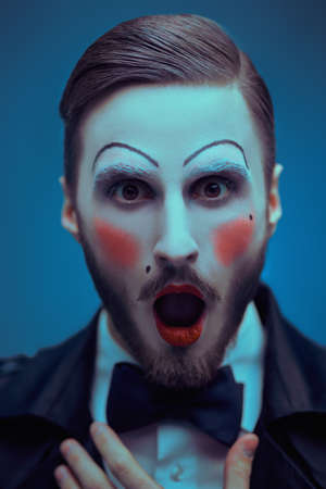 Art and fashion. Portrait of a young man with makeup in the style of the 20s in an elegant suit playing different life roles. Male mime artist.