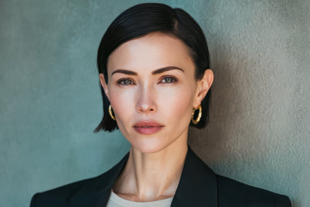 A woman stands against a green wall with a serious expression on her face. Her long hair is styled neatly. The background adds a simple touch to her appearance.