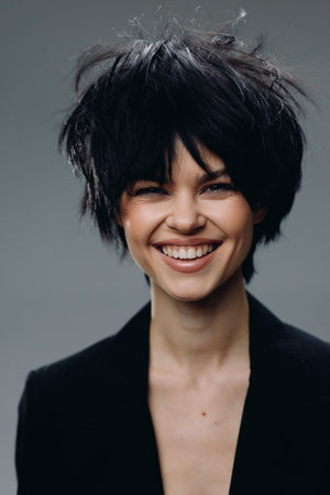 Smiling woman with messy black hair wearing a black jacket, expressing happiness and confidence in a studio setting.