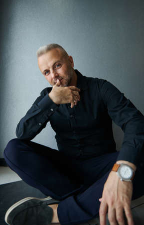 Handsome attractive middle aged Caucasian successful man in black casual suit, confidently looking at camera posing against gray wall background