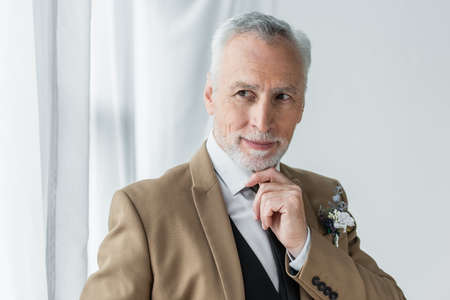 bearded middle aged man in suit with floral boutonniere smiling while looking away near white curtains