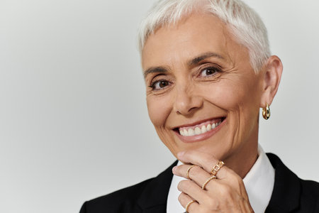 A mature woman with short hair confidently smiles in elegant attire.