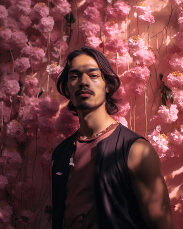 Portrait of a handsome young man in a black shirt on a background of pink flowers