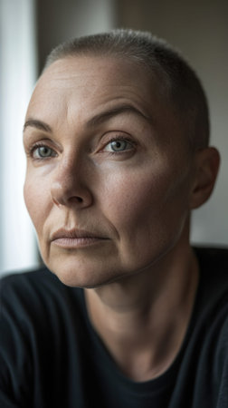 Portrait of a middle aged woman with shaved head and visible wrinkles, conveying a sense of vulnerability and strength