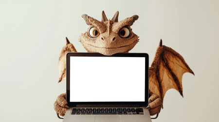 A cartoon dragon holds a laptop with a white screen in its paws. A laptop mockup for the presentation of a children's website. Online education for children. Online games for kids. The dragon has a menacing expression on his face
