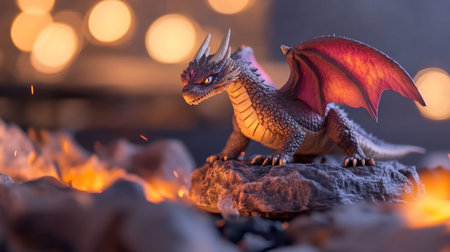 A detailed shot of a dragon statue, with red wings, sitting on a rock, illuminated by a warm, fiery glow. The background features soft bokeh lights.