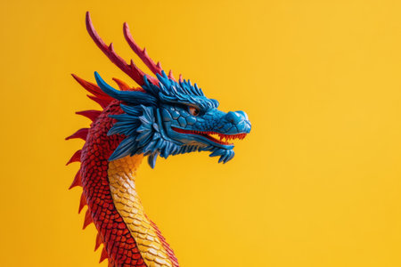 A detailed dragon sculpture showcases vibrant blue and red colors with fierce features. The bright yellow background enhances the artistic design and craftsmanship of the figure.