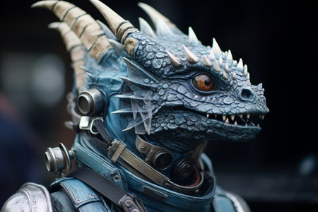 Dragon cosplayer wearing an intricate costume with reptilian scales and armored shoulder pads, representing a mythical beast