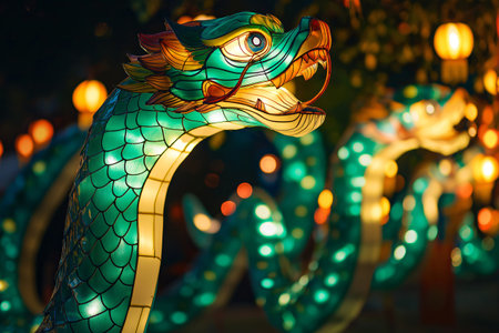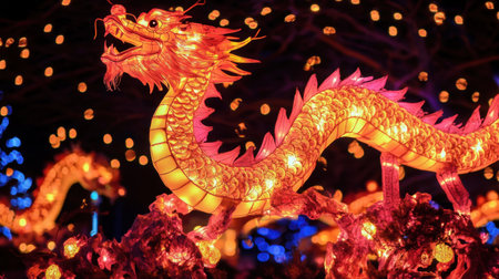 A vibrant display of illuminated dragon lanterns brightens the night during a cultural festival creating a captivating atmosphere for attendees.