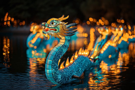 Dragon boat floating on the sea with bokeh light background.