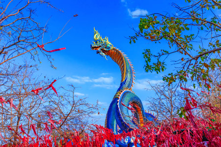 Naga statue on blue sky background at the temple, Thailand.