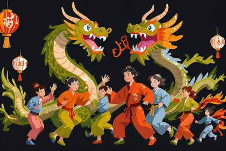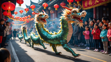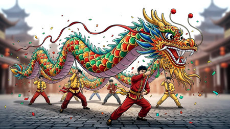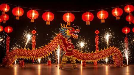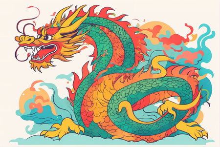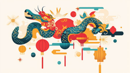 Colorful Chinese New Year Dragon Illustration Celebrating Traditions and Festivities with Lanterns.