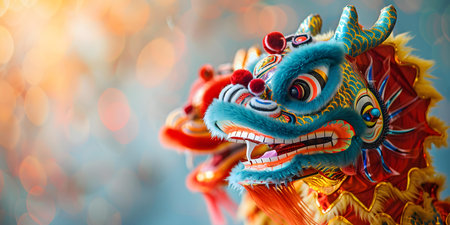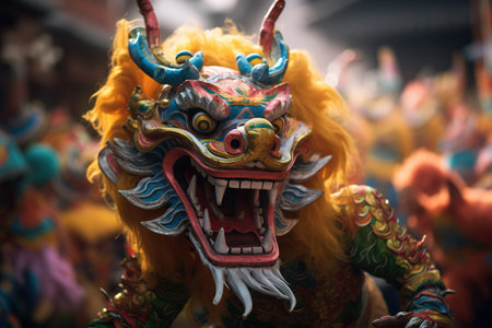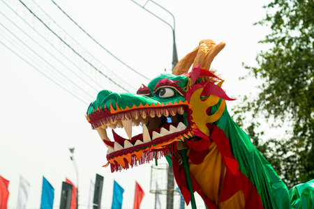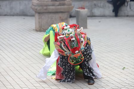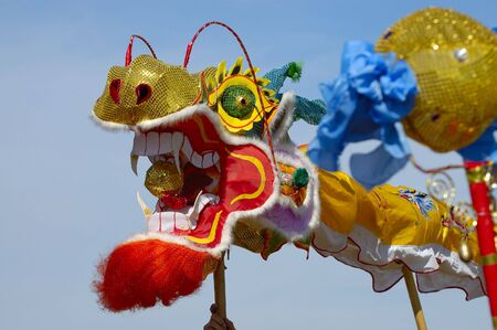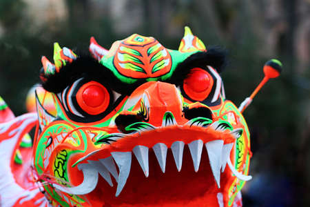 Chinese dragon head with ribbons at street celebration procession. Horizontal photo.