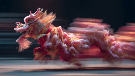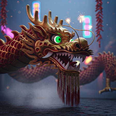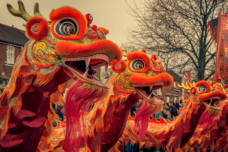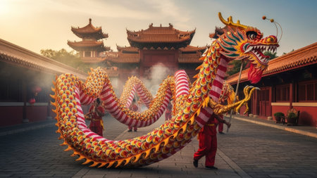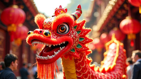 Vibrant Red and Gold Dragon Puppet Celebrating Chinese New Year. Concept of Cultural Festivities, Traditional Dance, Community Celebration.