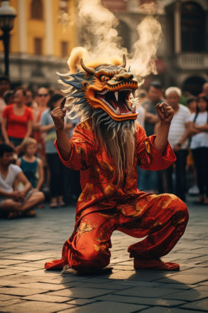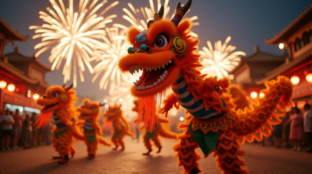 Performers dance in colorful costumes as they celebrate the New Year with a lion dance during a street festival in the city center.