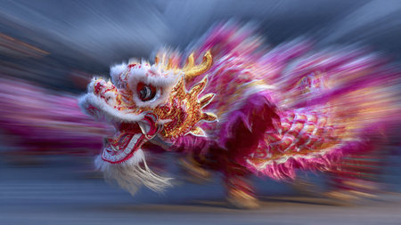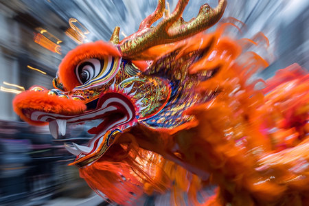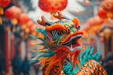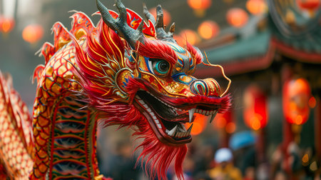 A close-up shot of a dragon head during a traditional Chinese dragon dance in Chinatown.