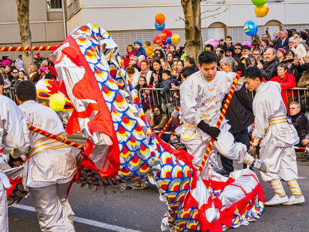 PARIS, FRANCE - FEBRUARY 17, 2019. Last day of the chinese new year celebration festival in street. People dragon lion dancing show colorful costumes. 200 thousands, multi ethnic asian man woman. Year of pig