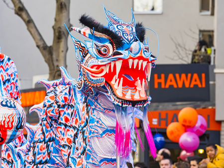PARIS, FRANCE - FEBRUARY 17, 2019. Last day of the chinese new year celebration festival in street. Dance of colorful blue dragons in the street during the parade festival. Close up head of dragon. Traditional celebration.