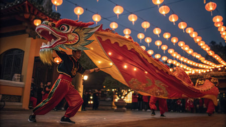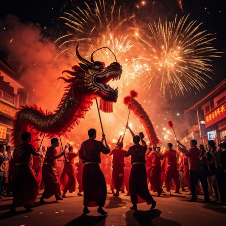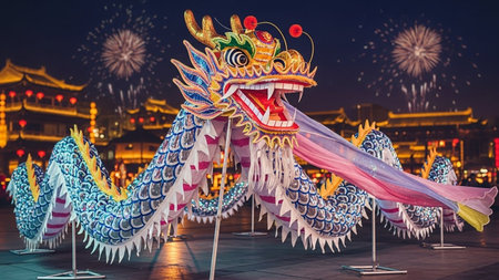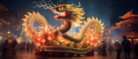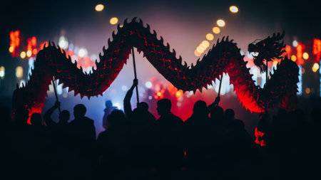 A magnificent illuminated dragon parade fills the night with vibrant energy and festive atmosphere during a Chinese celebration.