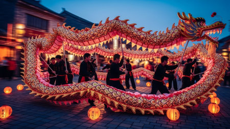 A dragon dance takes place at a festival. Performers showcase the colorful dragon while crowds watch with excitement. The night is lively with lights.