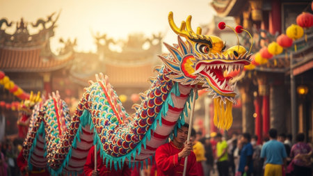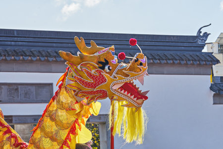 Golden Chinese dragon puppet head in street parade near temple roof, red details and yellow tassels, bright daylight and festive mood