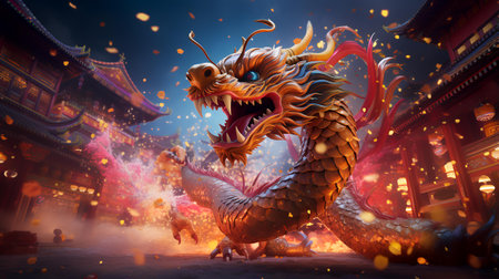 This captivating image depicts a golden dragon with intricate scales, illuminated by warm, glowing light. The dragon is set against a backdrop of floating lanterns and a serene night sky with a visible moon. A traditional pagoda-style building is also featured in the background, adding to the cultural ambiance of the scene. The image is visually striking due to the detailed and vibrant depiction of the dragon, the soft glow of the lanterns, and the tranquil night setting. Ideal for use in cultural-themed projects, fantasy art, and digital illustrations, this high-quality artwork captures the mystical and serene beauty of the dragon and its surroundings. Perfect for web banners, mobile app designs, and digital illustrations, this image will add a touch of cultural richness and magical tranquility to any project.