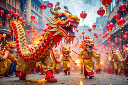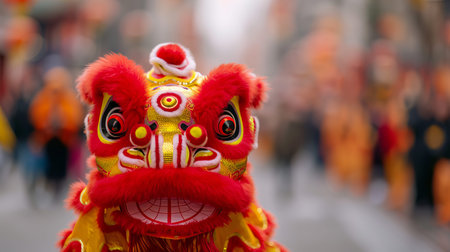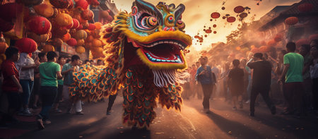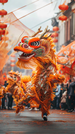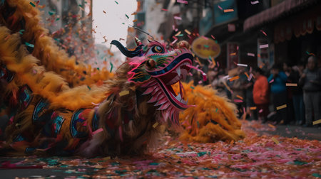 Chinese New Year Watercolor of Vibrant Lion Dance Amid Festive Street Celebration. Concept of cultural tradition, festive celebration, and colorful art.