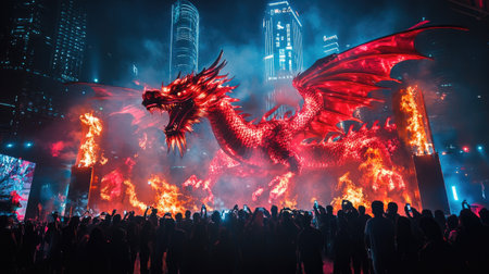 A dramatic dragon puppet head in a dark and vibrant performance setting