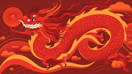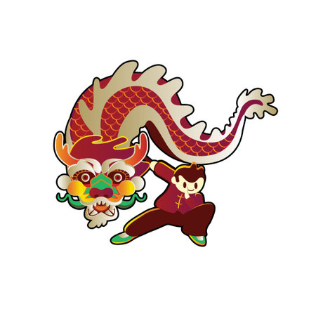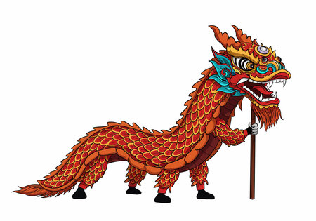 Dragon dance clipart. A red dragon with intricate scales is featured, holding a stick, showcasing vibrant and detailed artistry. Vector illustration design.