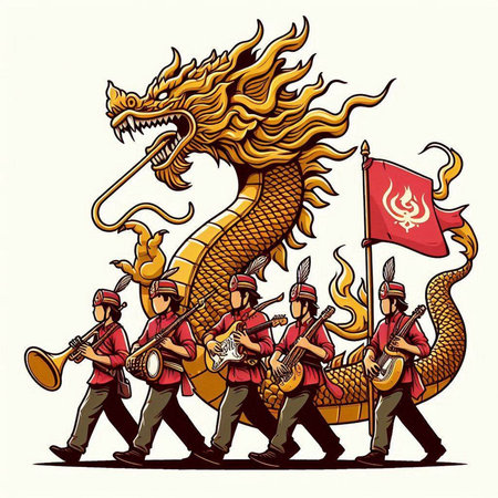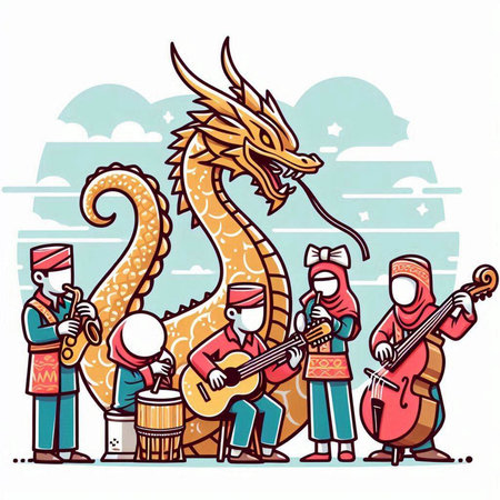 Dragon and musicians in traditional costume. Chinese New Year. Vector illustration.