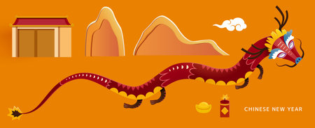 CNY element set isolated on orange background. Including red dragon, sycee, firecracker, oriental cloud, paper art building and mountains.